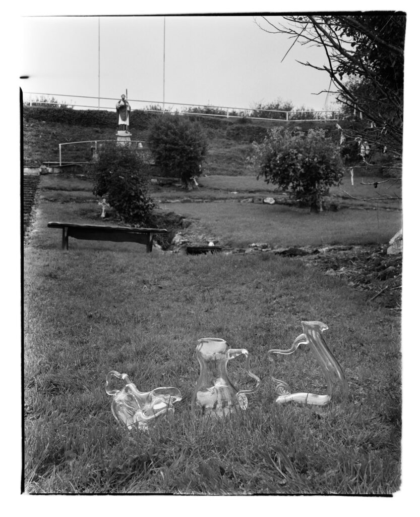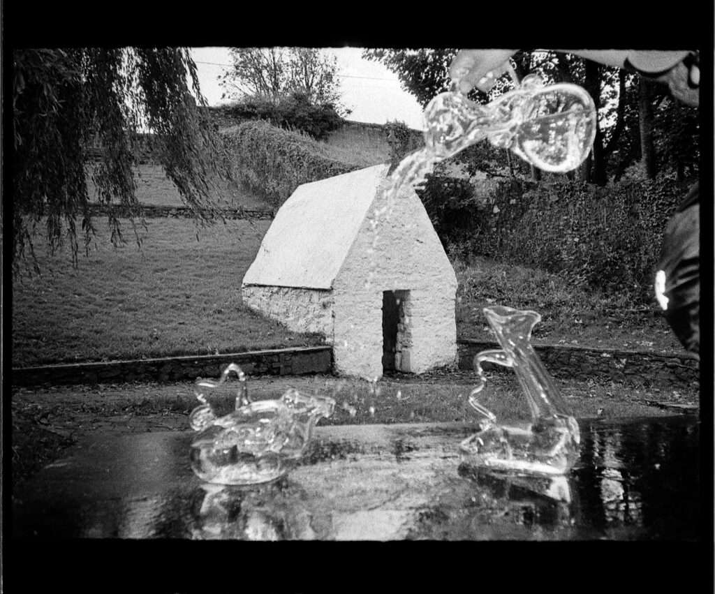You visited three wells in Ireland, St. Moling’s, Kenny’s, and St. Augustine’s. These sites are steeped in history and ritual. Whilst there, you used your glass pieces to collect and hold holy water from the wells. The containers themselves play such a key role in the work. Did the shape or atmosphere of the wells influence how you designed the glass works? Do you see them as utilitarian or sculptural? What did you do with the holy water then?