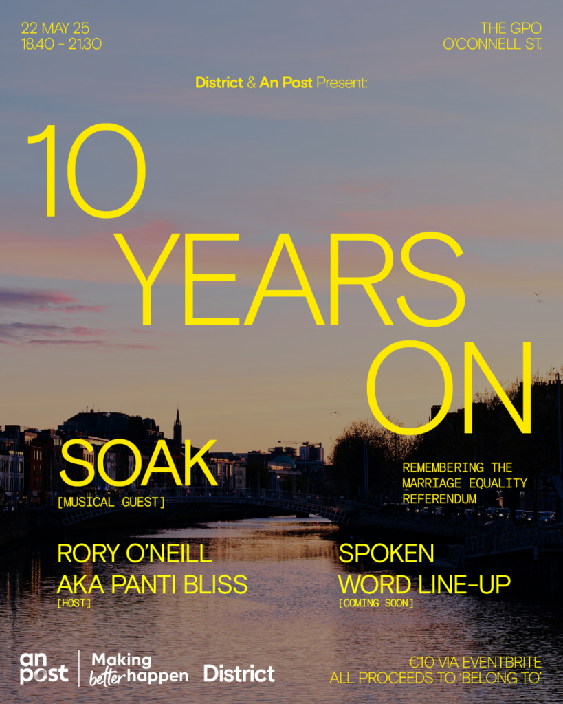 Today, a decade later, we’re honouring that pivotal moment and the journey that got us here in the GPO with a spoken word event in collaboration with An Post, hosted by Rory O’Neill, and featuring a special performance by SOAK. The GPO is a symbol of revolution, but today it’s also standing proudly as a space of reflection and celebration for a different kind of freedom: the right to love. There is still work to be done in Ireland, particularly as we see the erosion of Trans rights across Europe. However, anniversaries like this remind us of the power of unity, visibility, and courage. They invite us to both look back, and imagine what’s next.